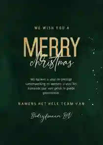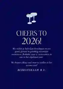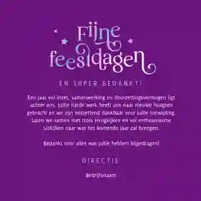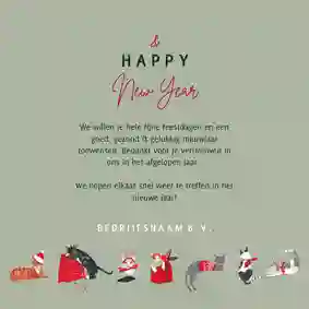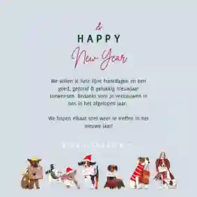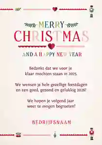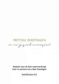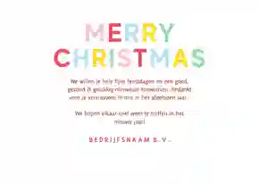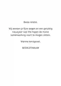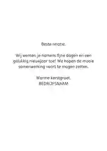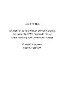 Een kerstkaart is niet compleet zonder een passende kerst- of nieuwjaarswens. Denk aan een dankwoord, een vooruitblik of een warme felicitatie voor het nieuwe jaar. De meeste kaarten bevatten al een voorbeeldtekst die je makkelijk kunt aanpassen. Op zoek naar nog meer ideeën? Neem dan een kijkje op onze inspiratie-omgeving voor zakelijke kerstkaarten.