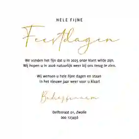 Met een kerstkaart laat je klanten op een persoonlijke manier weten dat je ze waardeert. De feestdagen zijn perfect om terug te blikken op het afgelopen jaar en alvast vooruit te kijken naar wat er in het nieuwe jaar mogelijk is. Alle zakelijke kerstkaarten zijn eenvoudig aan te passen. Voeg je bedrijfslogo toe, schrijf een warme kerstgroet en je bent klaar om je kaarten te versturen naar klanten en zakenpartners.