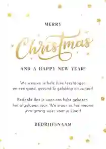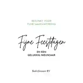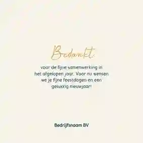 Een kerstkaart is niet compleet zonder een passende kerst- of nieuwjaarswens. Denk aan een dankwoord, een vooruitblik of een warme felicitatie voor het nieuwe jaar. De meeste kaarten bevatten al een voorbeeldtekst die je makkelijk kunt aanpassen. Op zoek naar nog meer ideeën? Neem dan een kijkje op onze inspiratie-omgeving voor zakelijke kerstkaarten.