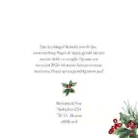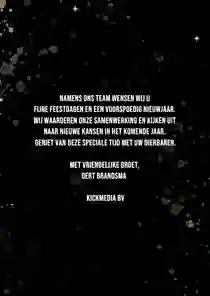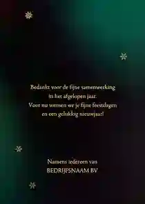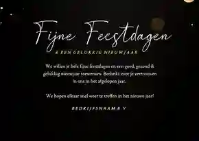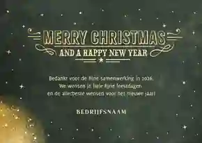 Een kerstkaart is niet compleet zonder een passende kerst- of nieuwjaarswens. Denk aan een dankwoord, een vooruitblik of een warme felicitatie voor het nieuwe jaar. De meeste kaarten bevatten al een voorbeeldtekst die je makkelijk kunt aanpassen. Op zoek naar nog meer ideeën? Neem dan een kijkje op onze inspiratie-omgeving voor zakelijke kerstkaarten.